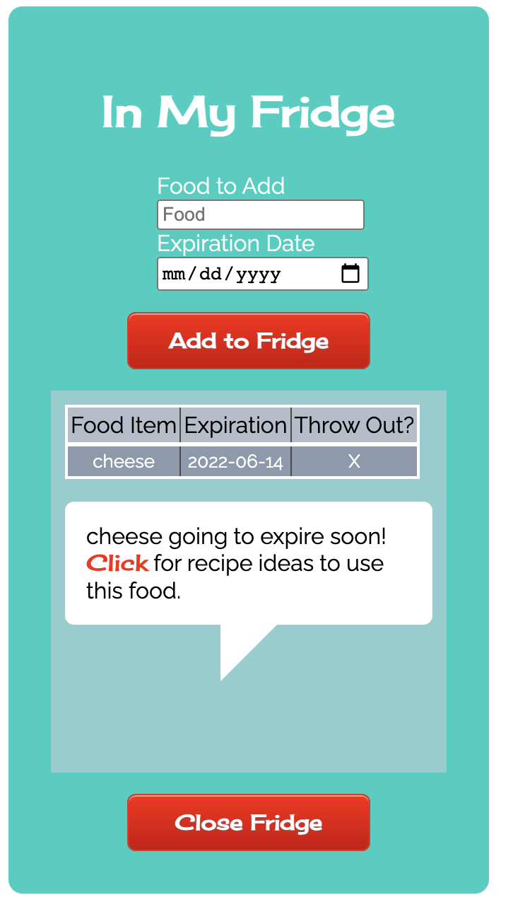 For this project I was required to build a mobile web application using JavaScript. I came up with the idea to make an app that keeps track of the food in a person’s fridge. When that food is starting to go bad, the app gives an alert and the option to search for recipes that use that ingredient. I created the recipe search using an external API.